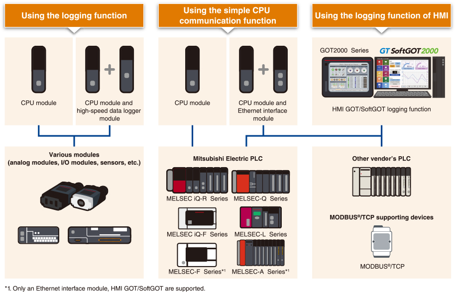 Thu thập dữ liệu từ các thiết bị khác nhau và Bộ điều khiển logic khả trình (PLC) của các nhà cung cấp khác với chức năng ghi log và chức năng giao tiếp CPU đơn giản.