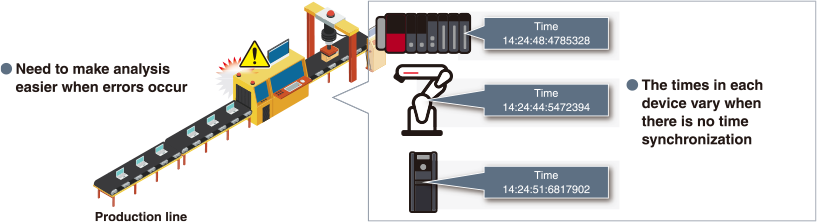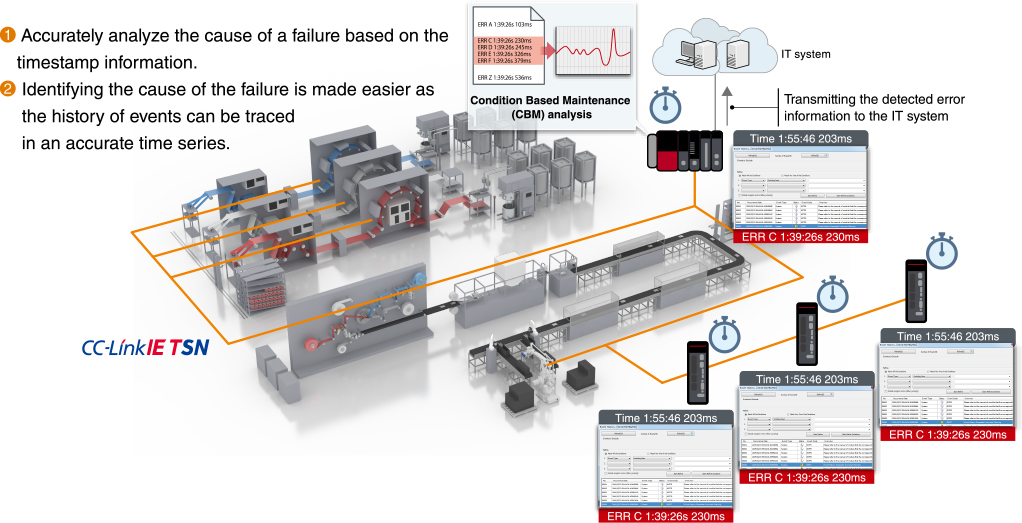 - By using the time synchronization protocol prescribed by TSN, time lags between devices supported by CC-Link IE TSN are corrected to achieve highly precise time synchronization. The time information of each master and device is synchronized to the microsecond. So if a failure was to occur in the network, an accurate sequence of events leading up to the failure can be traced when analyzing the operation.