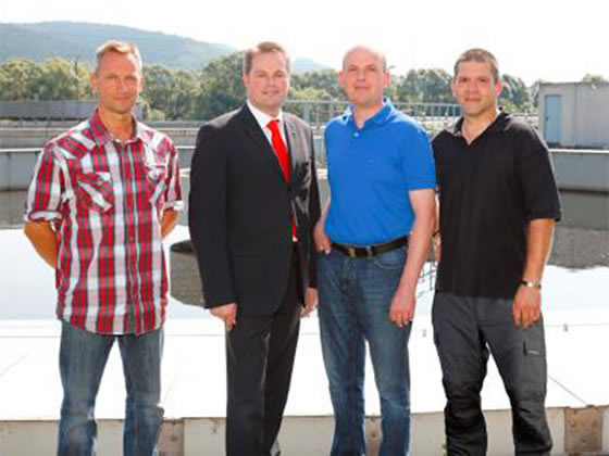 Từ trái sang phải, Michael Böttner, Lập trình viên, Công ty Willich Elektrotechnik GmbH, Christoph Behler, Giám đốc Phát triển Kinh doanh Cao cấp, Mitsubishi Electric Europe B.V., Stephan Heckeroth, Giám đốc Vận hành, Stadtwerke Rotenburg a. d. Fulda, Antonio Genovese, Quản lý Nước thải của cơ sở xử lý nước thải đô thị Rotenburg a.d. Fulda.