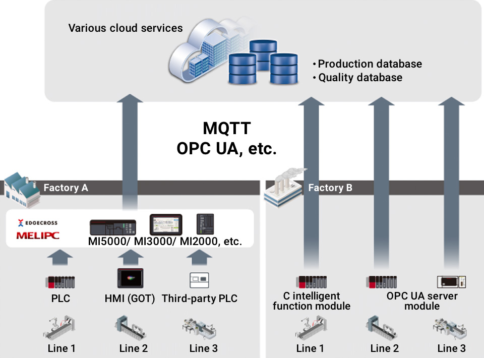 Thu thập và sử dụng dữ liệu sản xuất và chất lượng trên quy mô toàn cầu, bao gồm cả các nhà máy ở nước ngoài. Thông tin về hoạt động và chất lượng của tất cả các thiết bị được thu thập bởi Edgecross và Bộ điều khiển logic khả trình (PLC), sau đó được truyền tải lên đám mây thông qua một giao thức truyền thông an toàn như MQTT và OPC UA.