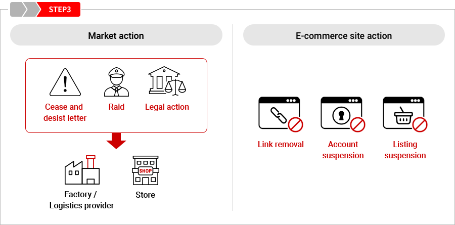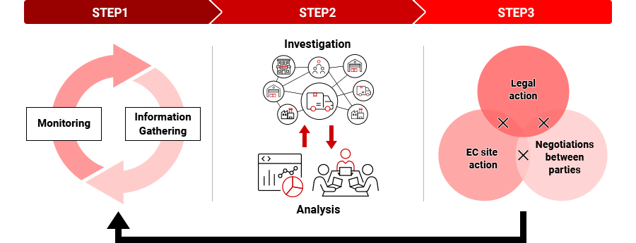 In addition to gathering information broadly from our regional overseas offices, investigative agencies, local authorities, and local business partners, we conduct regular market monitoring to detect counterfeit products.