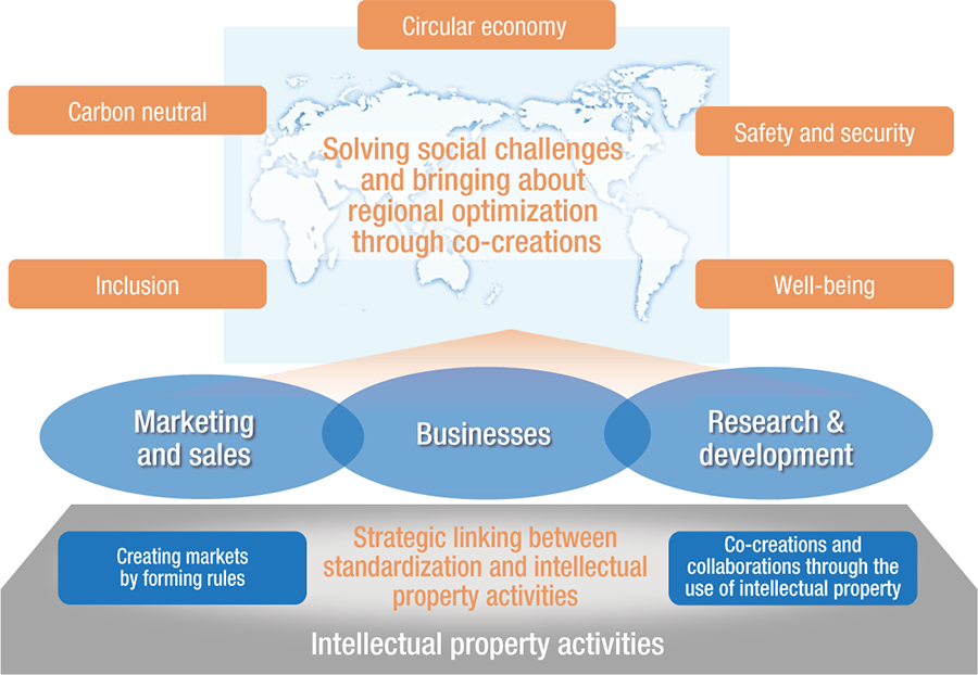 Strategically link the Group's intellectual property and international standardization activities to front-load business initiatives, ensure competitiveness, grow new markets, set the stage for future growth, and offer solutions to social challenges. These focus areas are meant to transform the Group into innovative companies that create sustainable management in support of Group-wide businesses, marketing, sales, and research and development.