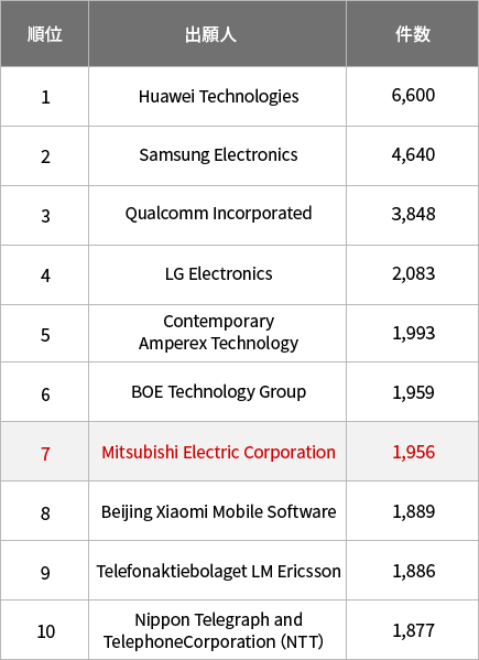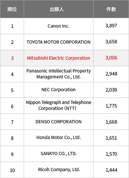 Indicators of the globalization of Mitsubishi Electric Group's intellectual property capabilities and activities include the Group ranking 3rd in Japan for the number of patent registrations (2024) as announced by the Japan Patent Office (JPO), ranked 7th in the world (and first Japan domestic company) for the number of top international applications (2024) announced by World Intellectual Property Organization (WIPO).