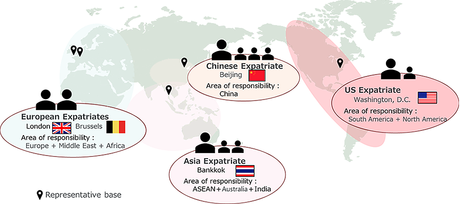 The Mitsubishi Electric Group is accelerating the globalization of its intellectual property activities by filing applications in advance of business expansion in emerging countries where future business is expected. In addition, the Group has stationed representatives in charge of intellectual property activities at each of our locations in the United States, Europe, China, and Southeast Asia, to support the strengthening of the intellectual property capabilities of our business bases, research institutes, and affiliated companies in each country, as well as to collect, research, and analyze information on policies and international standardization trends related to the laws and regulations across the globe.