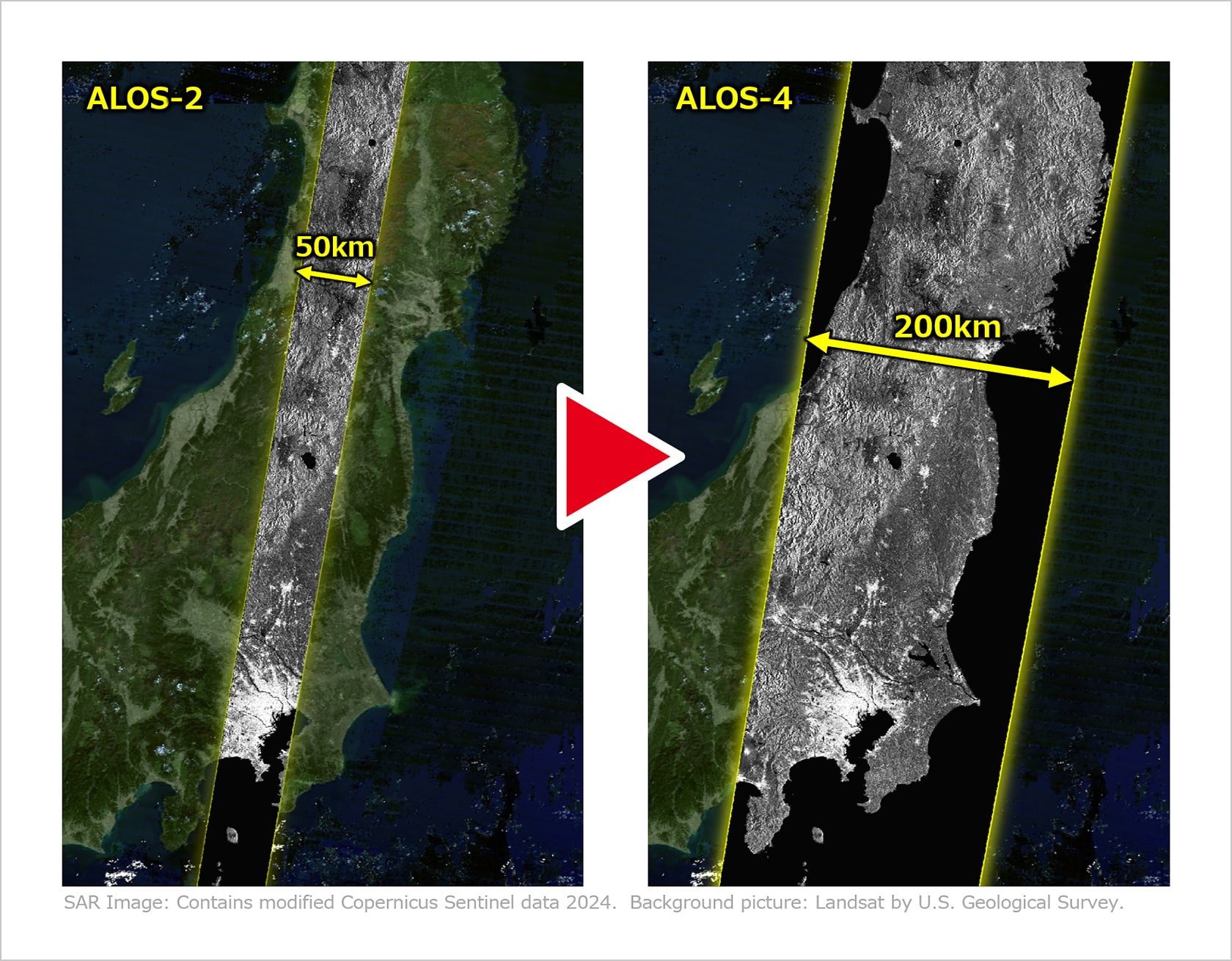 ALOS-2’s observation swath is 50km in high resolution, which means that it takes about 56 days for it to observe throughout Japan and can supply observation data for entire Japan no more than four times a year. On the other hand, it only takes 14 days for ALOS-4, which has a significantly enhanced swath of 200km, to observe all over Japan. As a result, ALOS-4 can supply observation data for entire Japan as many as 20 times a year.