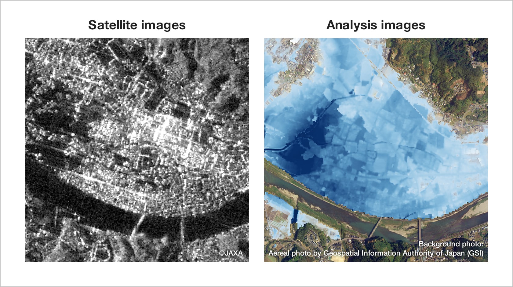 Radar satellites send monochrome images resembling the images of babies and organs captured by medical ultrasound scanners. These are difficult to figure out what is in the image. To solve this problem, Mitsubishi Electric’s satellite observation solution division processes images before providing customers with the data so that, for example, in flooding, the range of damage stands out, by coloring the affected areas, and overlaying the image over a map.