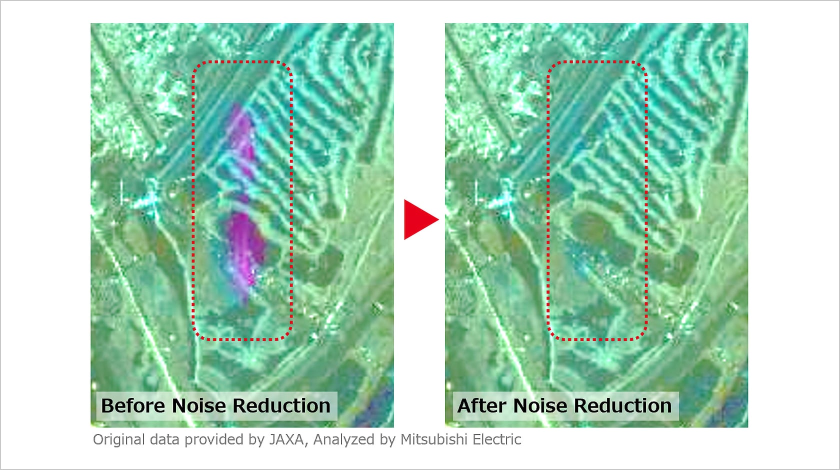 Sango: Mitsubishi Electric has acquired several patents regarding satellite image analysis treatment and processing. One of those is pertinent to "noise reduction." The images of land surface taken by radars are often affected by the interference of strong signals originated from urban areas. By removing those noises to make the original targets clear to see, this technology helps achieve more accurate analysis results of ground deformation monitoring.