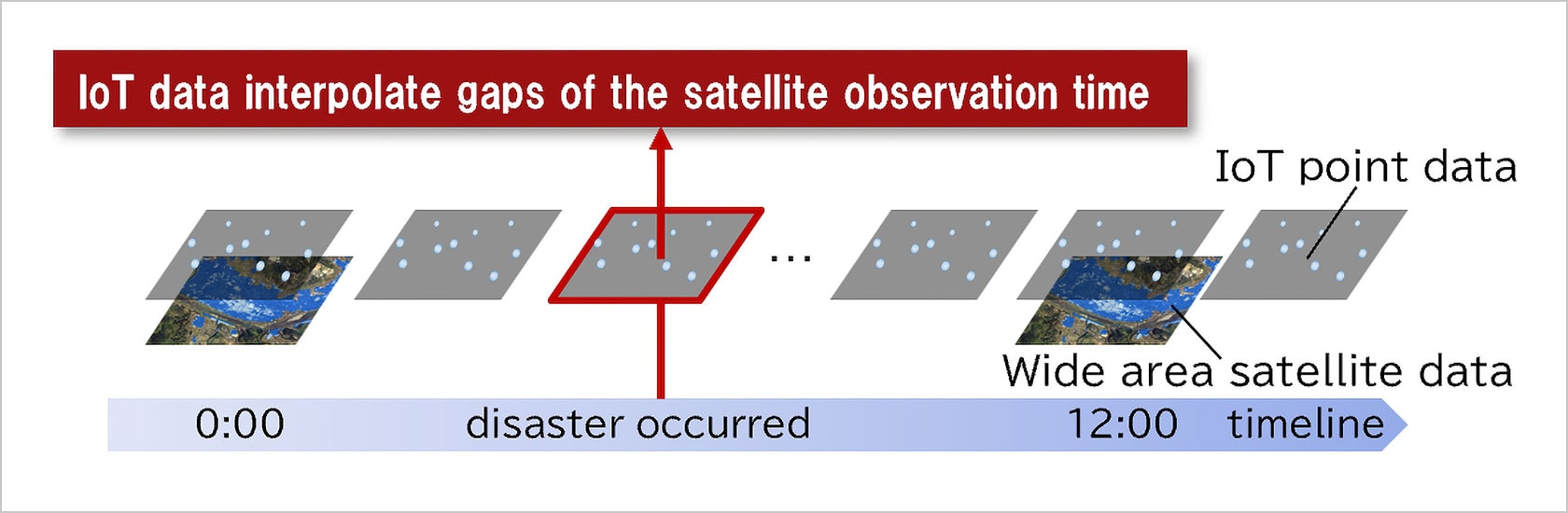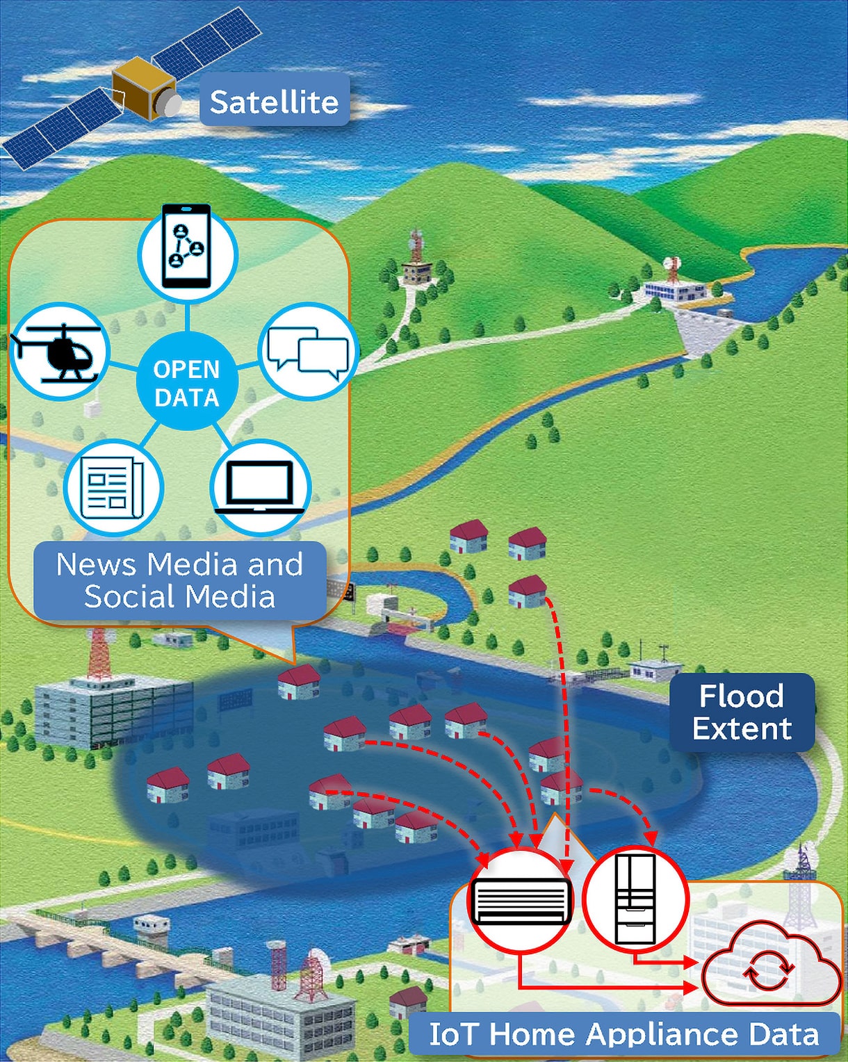 Mitsubishi Electric is also working to develop new products and services that utilize satellite data. One of those initiatives is linking with IoT home electrical appliances. For instance, when a home air conditioner’s external unit is submerged during flooding, signals are sent out to the manufacturer. By collecting these signals to compare with satellite data, flood damages can be assessed for a wider area and in more details.