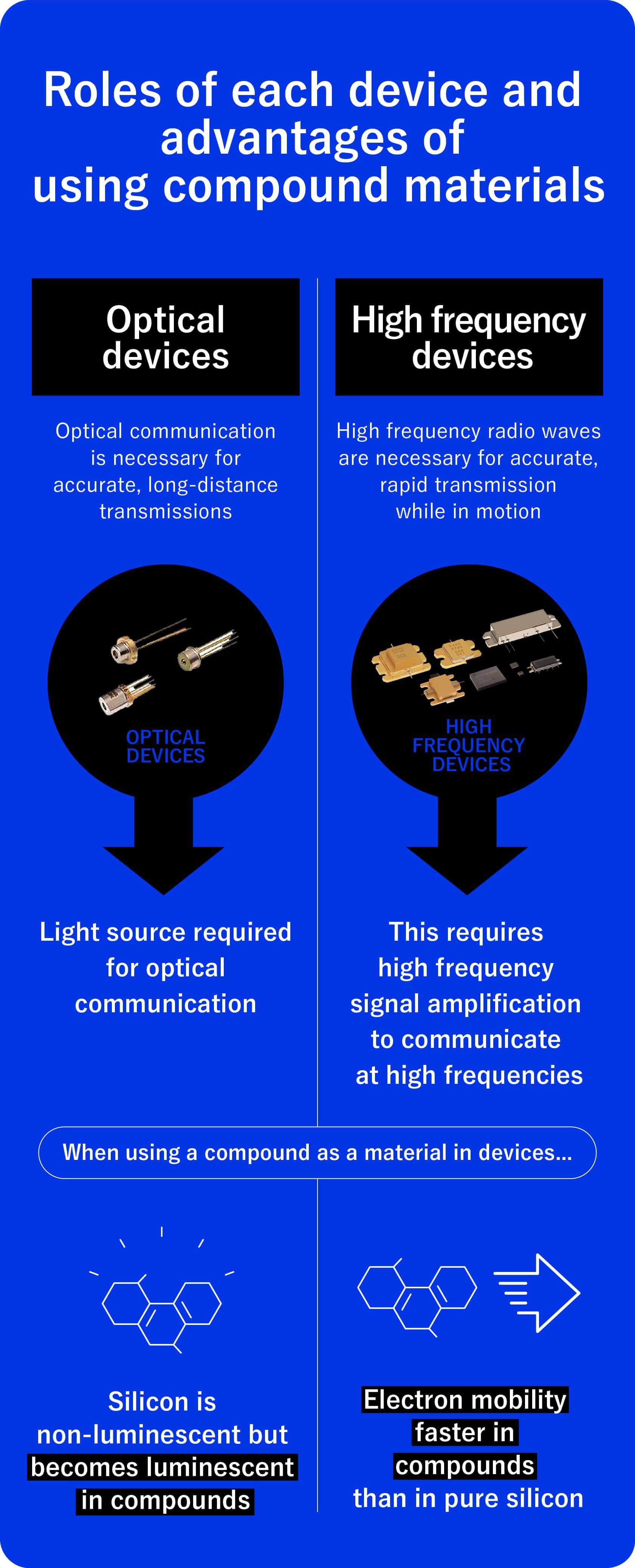 Technologies like optical devices for fiber-optic communication and high frequency devices for satellite transmission and smart phones.
