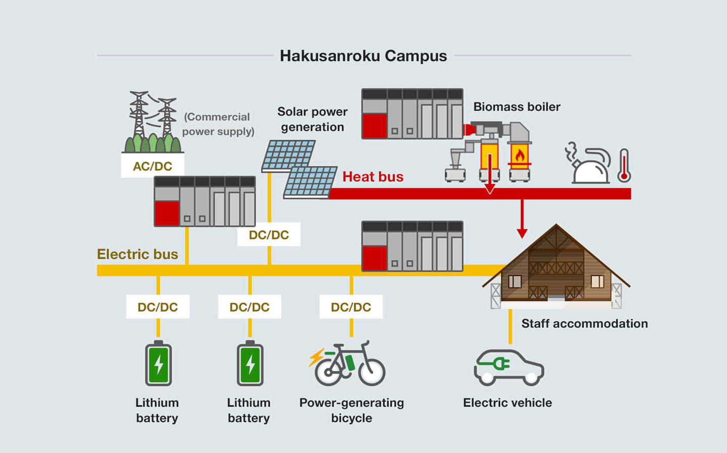 “The most important point of the DC microgrid system is the unification of the flow of electricity, in other words the ‘making, sending (storing), and using,’ of electricity as DC. Solar power generation produces DC electricity, which power companies then convert to AC before transmitting to the grid. In the case of a DC microgrid system, electricity is transmitted as DC, which means it is both distributed and used in the state it was originally generated in. By standardizing the type of electricity to DC, which is stable and not easily susceptible to power outages, we have built a system that we believe is superior in terms of resilience.”