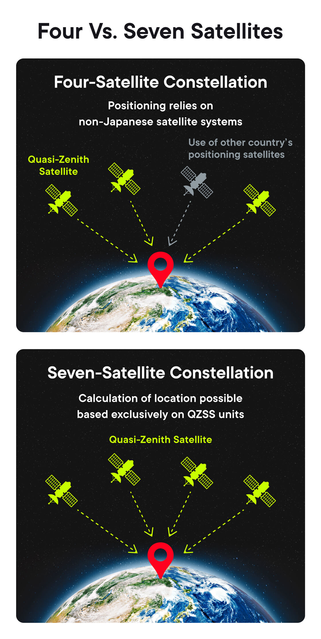 In order to ensure the stable provision of location information, Japan decided in the early 2000s that it would establish its own positioning system based on a constellation of domestically-produced satellites, leading to the launch of the first Michibiki satellite in 2010. Since 2018, the resulting Quasi-Zenith Satellite System (QZSS), known as Michibiki, has been operating with four satellites. Plans are in place to launch three additional satellites by FY2025, bringing the total to seven.