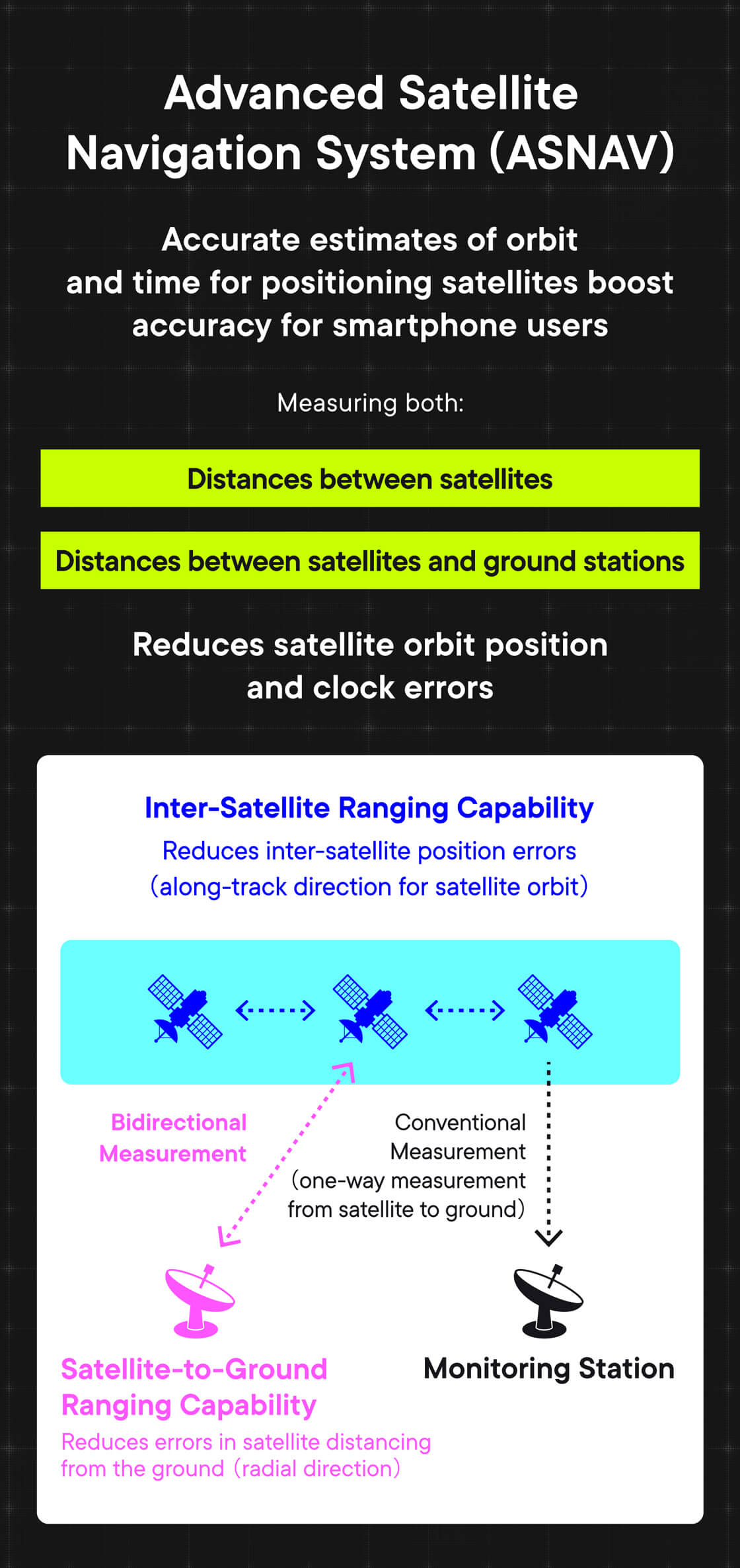 To address these limitations, Michibiki satellites Nos. 5 through 7 will be equipped with two new ranging functions—one to measure the relative distance between satellite units, and another to measure distances between satellites in orbit and ground stations. These ranging functions will allow for improved tracking of position and time information, simultaneously boosting accuracy by minimizing discrepancies related to positioning. With these additions, JAXA intends to demonstrate the viability of its longer-term goal of achieving one-meter positioning accuracy for users of smartphones and other standard receivers.