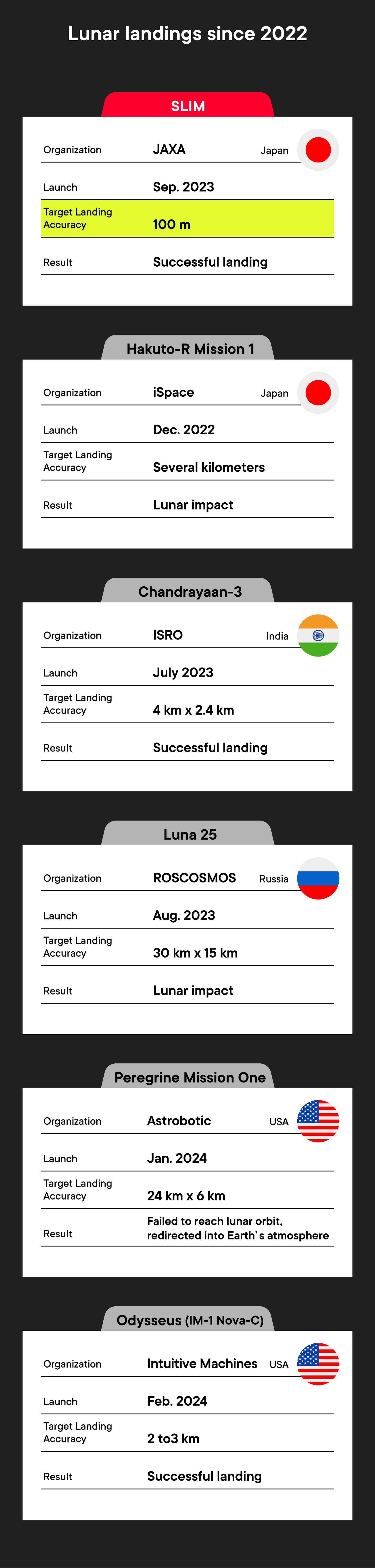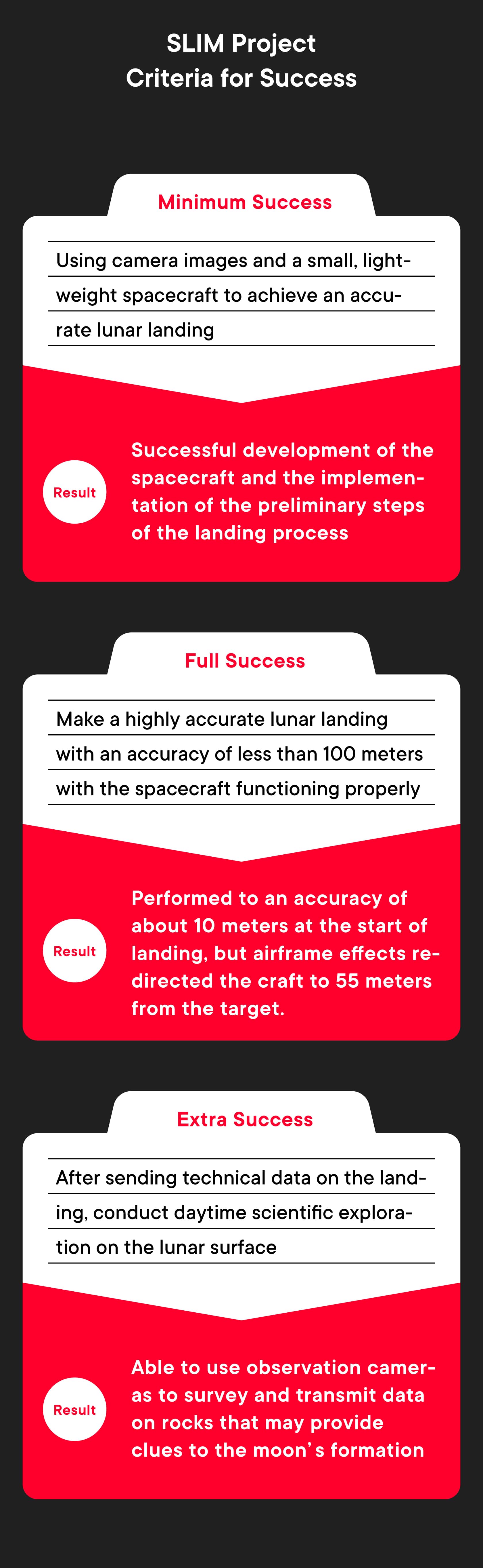 - On January 20th, SLIM completed the landing sequence and made a pinpoint landing just 55 meters from the target. It’s estimated that it would have achieved an accuracy of about 10 meters if it hadn’t lost one of the two main engines during the landing. Why do you think this first demonstration was such a great success?