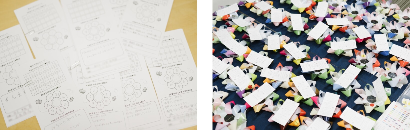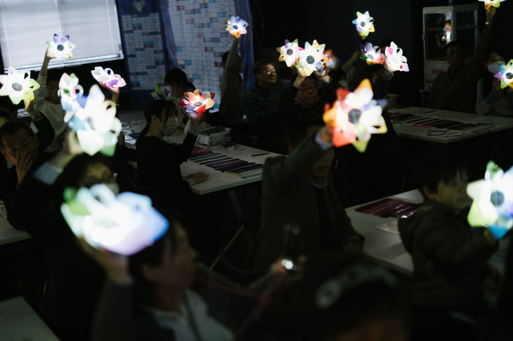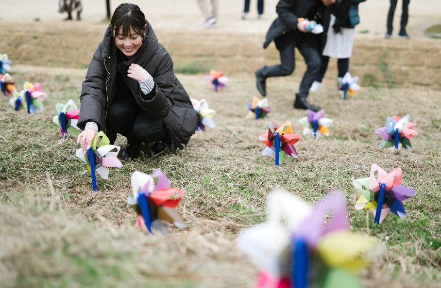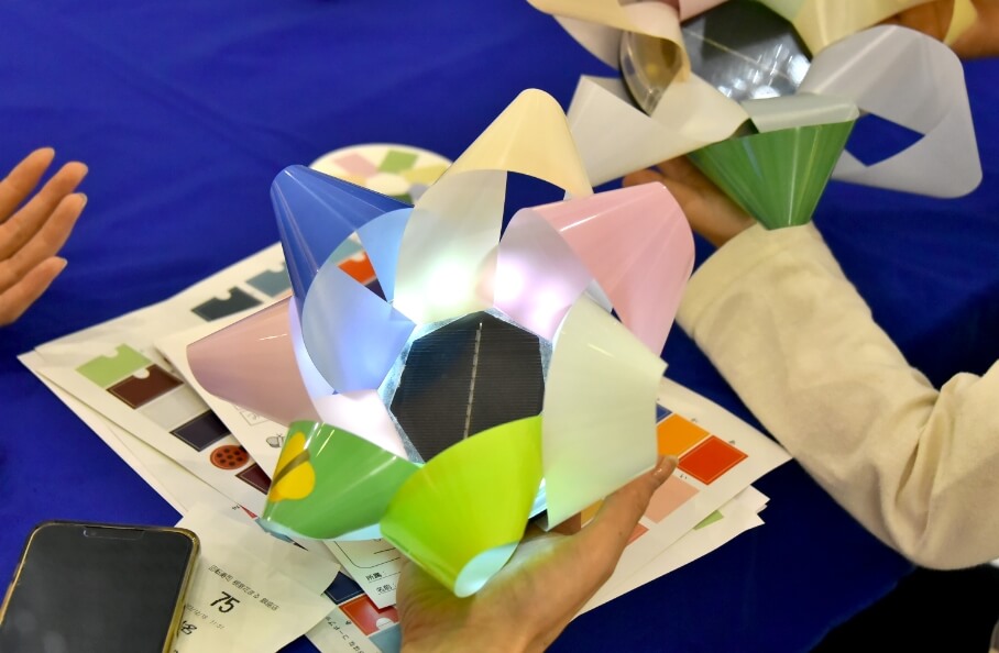 The "aiueohana" art project, on the other hand, is an art project by Kyoto City artist Kyota Takahashi. Participants come up with a "Mahou no Kotoba" (magic word) that expresses a "message to your future self" in seven hiragana letters. Each of the 50 hiragana syllables is assigned a color, so participants will check the color of the "Mahou no Kotoba" they have thought of, make seven flower petals out of strips of film, and attach them to solar lights to complete the "glowing flowers".