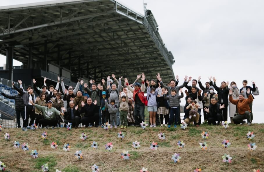 Commemorative photo at Imabari Satoyama Stadium after participants completed their flowers.