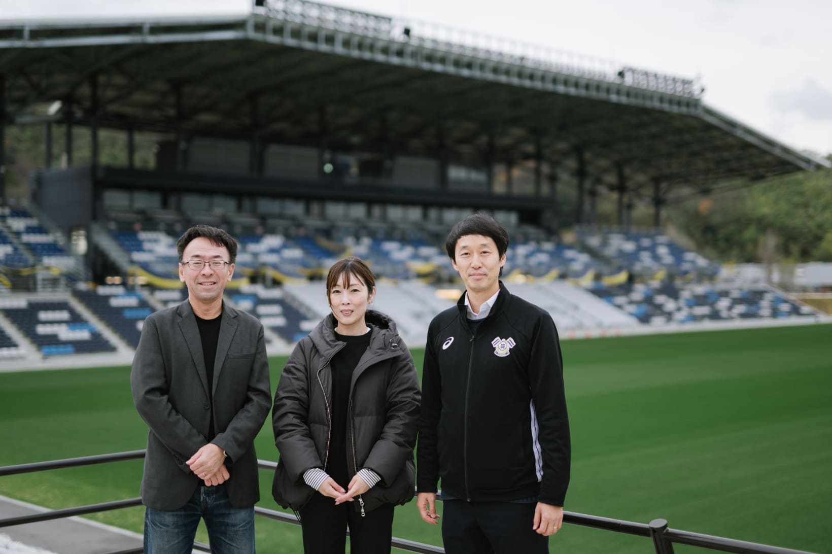 From left, Mr. Yoshida and Ms. Yamazaki of the Ehime Branch of Mitsubishi Electric Corporation, Shikoku Branch Office, and Mr. Tobita of FC Imabari.